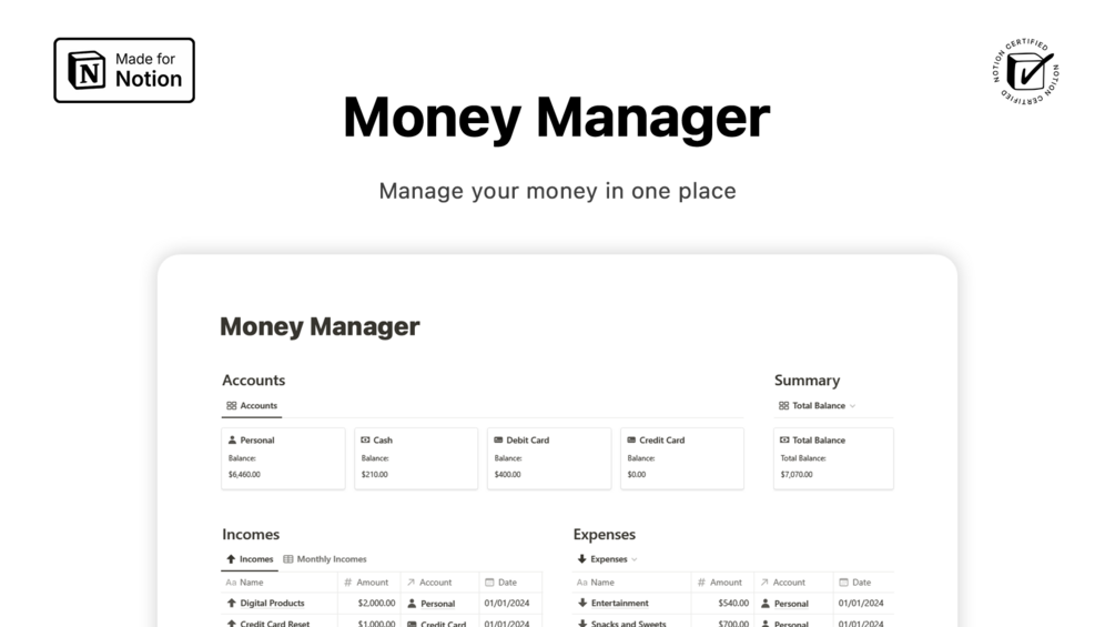 With Notion Money Manager, you can efficiently manage your finances and gain valuable insights into your income and expenses.